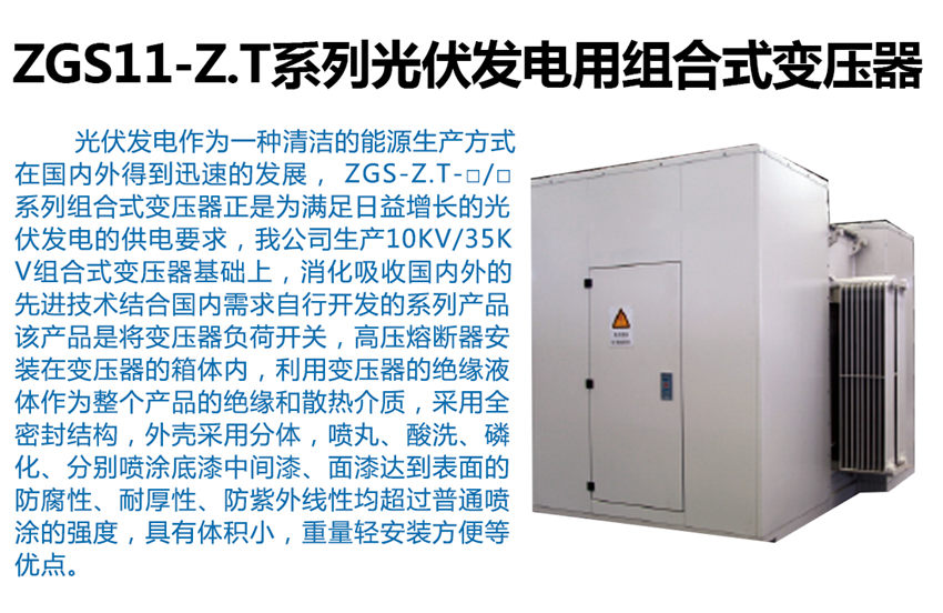 ZGS-Z.T-□/□系列組合式變壓器是消化吸收內(nèi)外的先進技術結(jié)合內(nèi)需求自行開發(fā)的系列產(chǎn)品,該產(chǎn)品是將變壓器,負荷開關,高壓熔斷器安裝在變壓器的箱體內(nèi),利用變壓器的絕緣液體作為整個產(chǎn)品的絕緣和散熱介質(zhì),采用全密封結(jié)構(gòu),外殼采用分體,噴丸、酸洗、磷化、分別噴涂底漆、中間漆、面漆達到表面的防腐性、耐厚性、防紫外線性均超過普通噴涂的強度,具有體積小,重量輕、安裝方便等優(yōu)點。