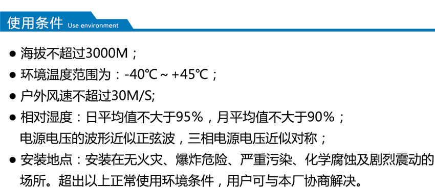 適用于自然條件比較惡劣的海灘、草原、荒漠等無火災、無嚴重污染、無化學腐蝕介質(zhì)和粉塵、無爆炸性危險運行環(huán)境,可用于戶外、又可用于戶內(nèi)。