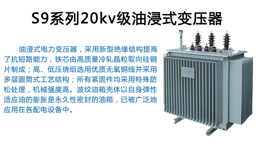S9系列20kv級油浸式變壓器為配電網(wǎng)絡(luò)與工礦企業(yè)供配電系統(tǒng)中的重要設(shè)備,在工礦企業(yè)、農(nóng)業(yè)和民用建筑中廣泛使用,也可用于石油、化工行業(yè)中多油污、多化學(xué)物質(zhì)的場所。使用環(huán)境:戶外/戶內(nèi)使用,海拔不超過1000m。